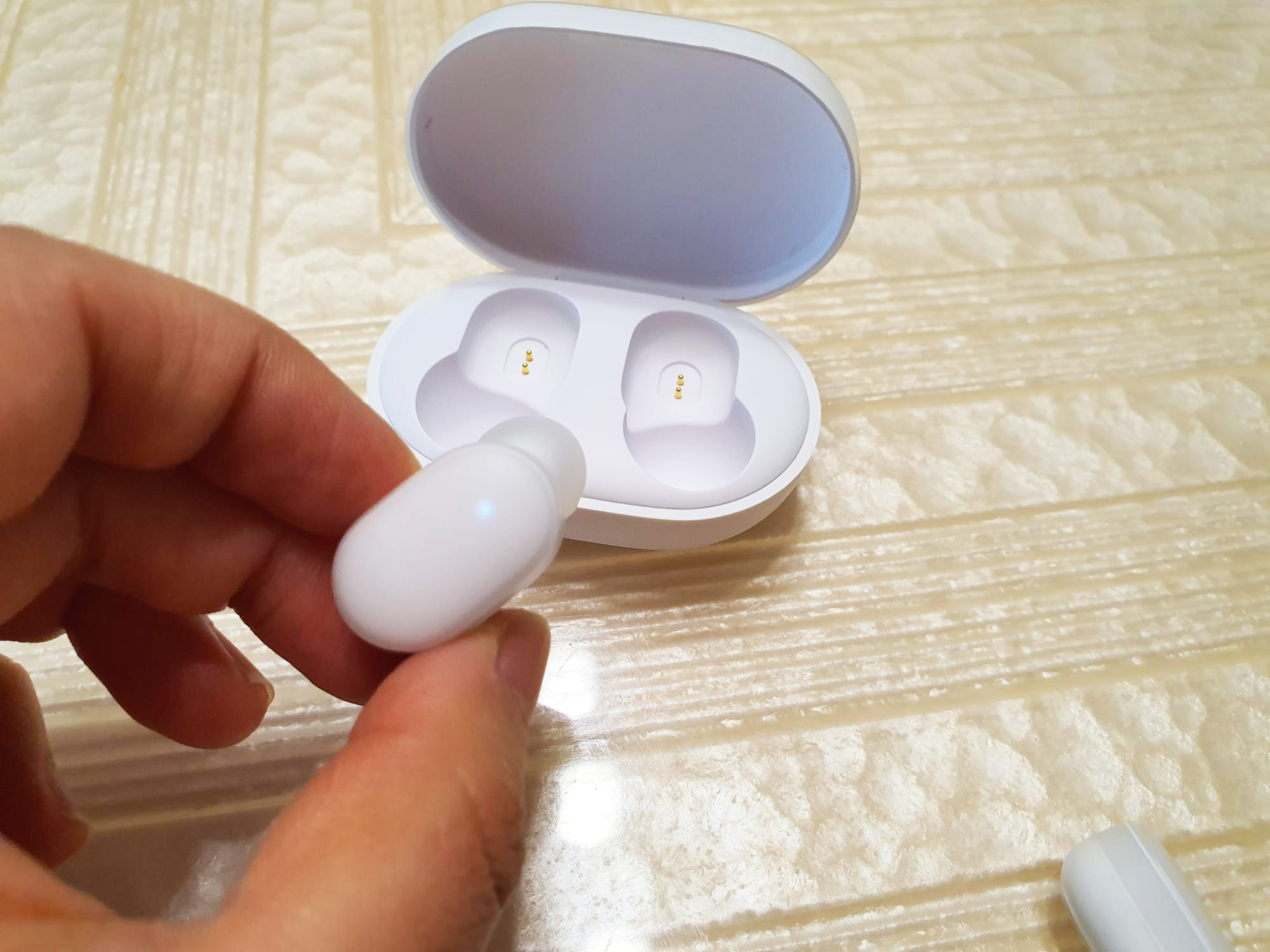 충전케이스에서 꺼낸 후, 하얀색 불이 빠르게 깜빡이면 핸드폰의 블루투스를 켜고