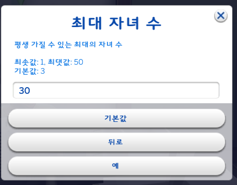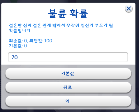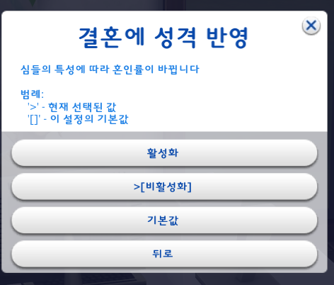기본값은 각각 20씩 설정되어있고, 결혼할 확률을 높이고 싶으면 이보다 큰 숫자를 써넣으면 된다.
