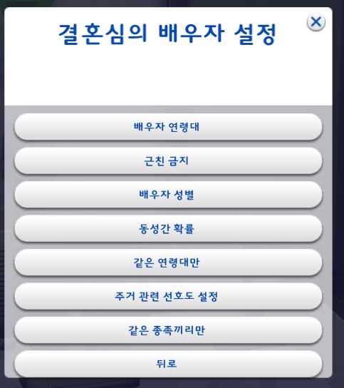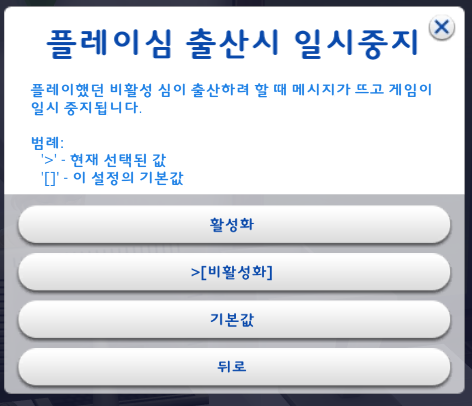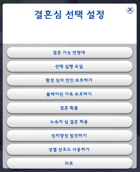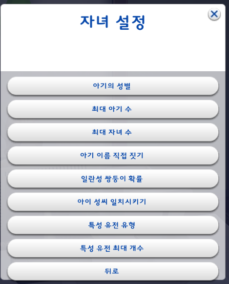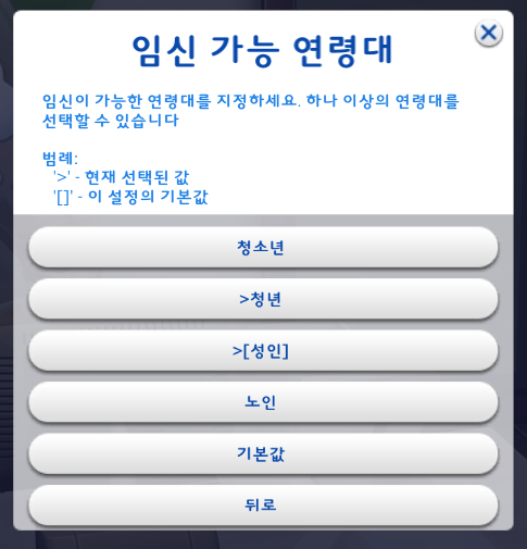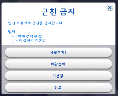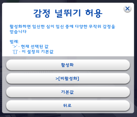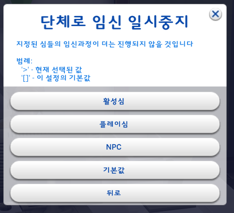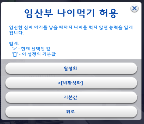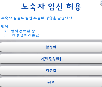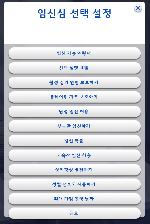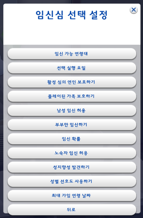 원하는 대로 설정을 하고 '뒤로' 를 눌러서 임신심 선택설정 창으로 돌아간다.