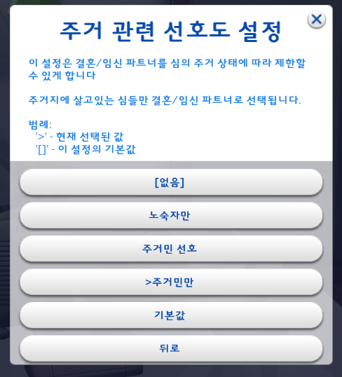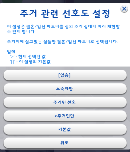심의 주거상태에 따라 파트너 설정이 가능하다. 노숙자 심의 자식을 갖는게 싫다면 꼭 설정해야 한다.