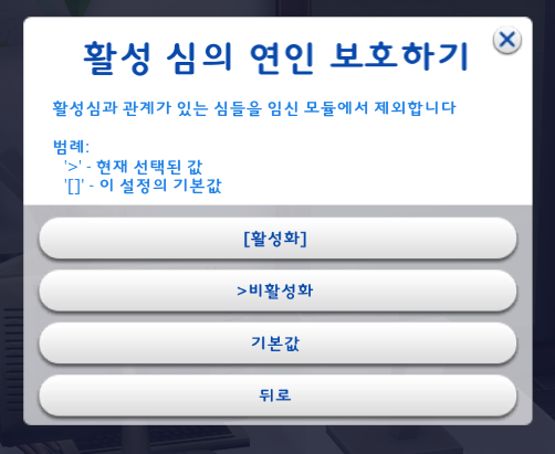 1-3. '활성 심의 연인 보호하기' : 활성화하면 내가 현재 플레이하고 있는 심의 연인은 임신 관계에서 제외된다.