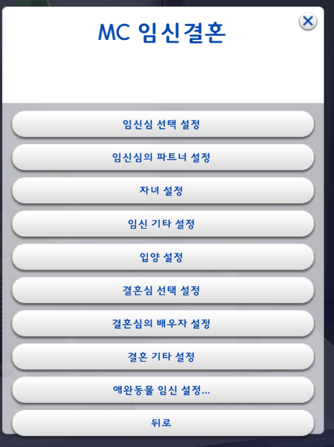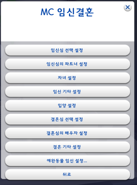 여기까지 설정했으면 뒤로, 뒤로를 눌러서 MC임신 결혼으로 돌아가자.