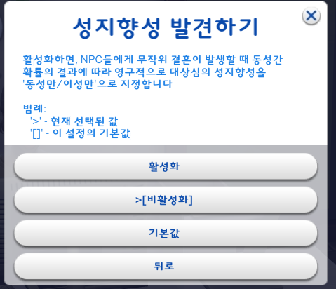 상대 심의 성별 선호도를 고려하면 활성화, 고려하지 않고 무작위 결혼하면 비활성화