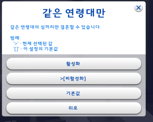 기본적으로 '성인'으로 되어있는데 '청년, 성인' 으로 설정하면 자동 결혼이 조금 더 많이 일어나게 된다.