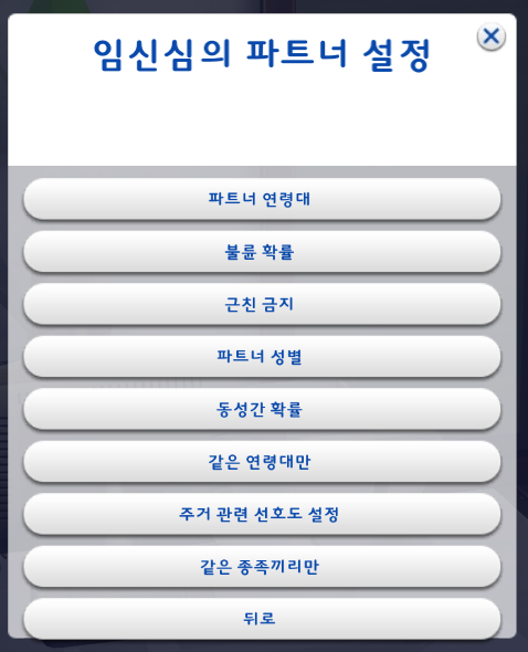 '뒤로'를 눌러서 다시 임신심의 파트너 설정으로 들어간다.