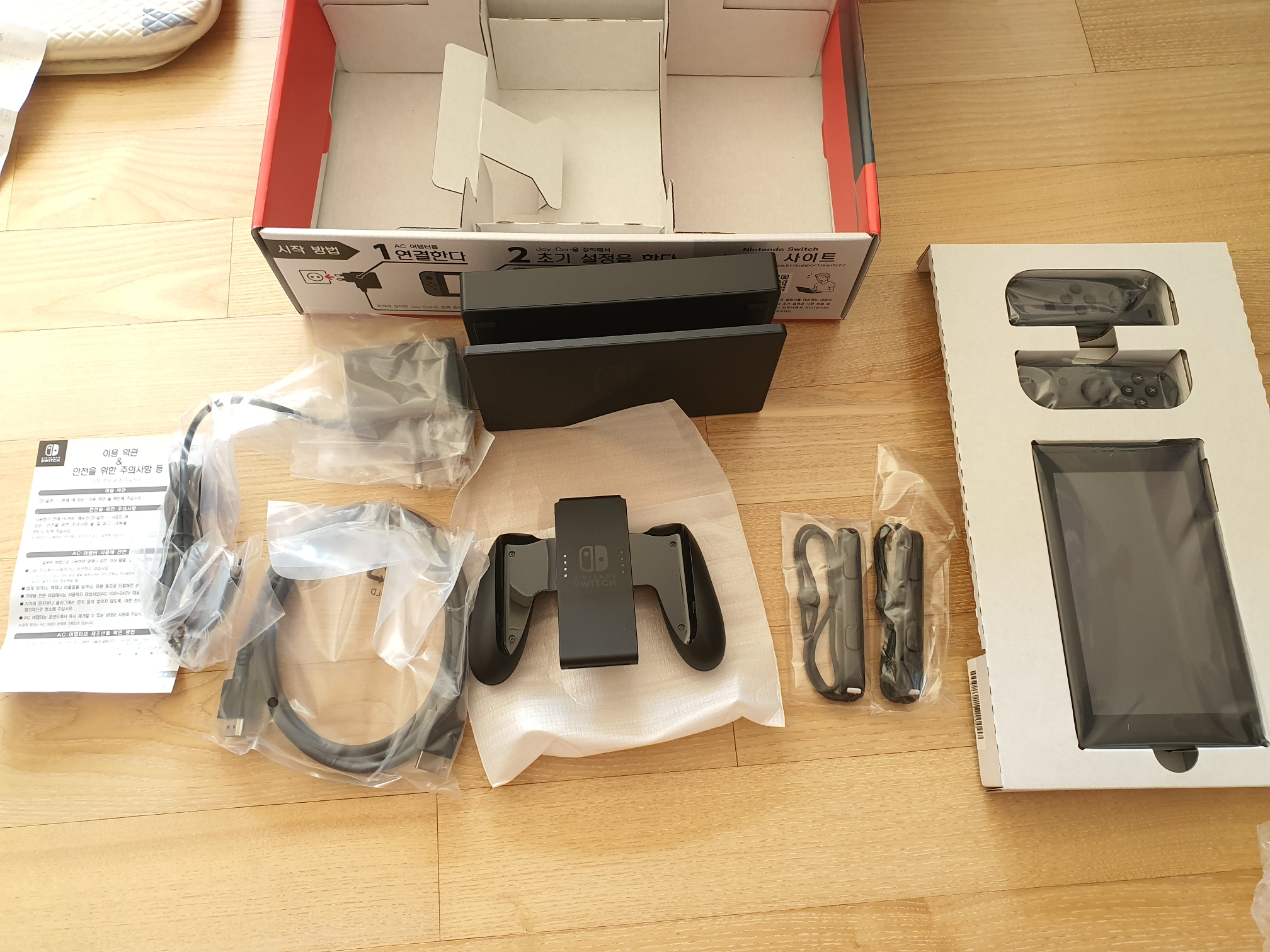 조심스레 들어보니 아래층에 어댑터와 케이블, 주의사항, 조이콘 그립과 본체 독 등이 비닐에 싸여 들어있었다.
