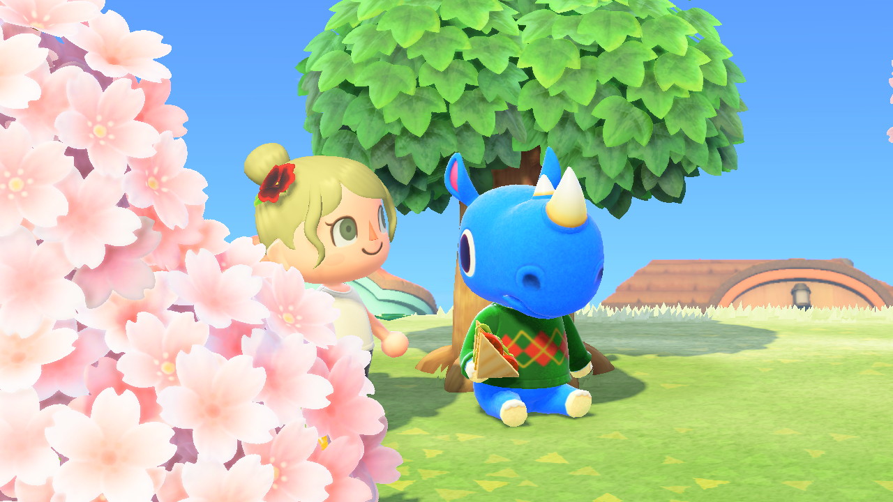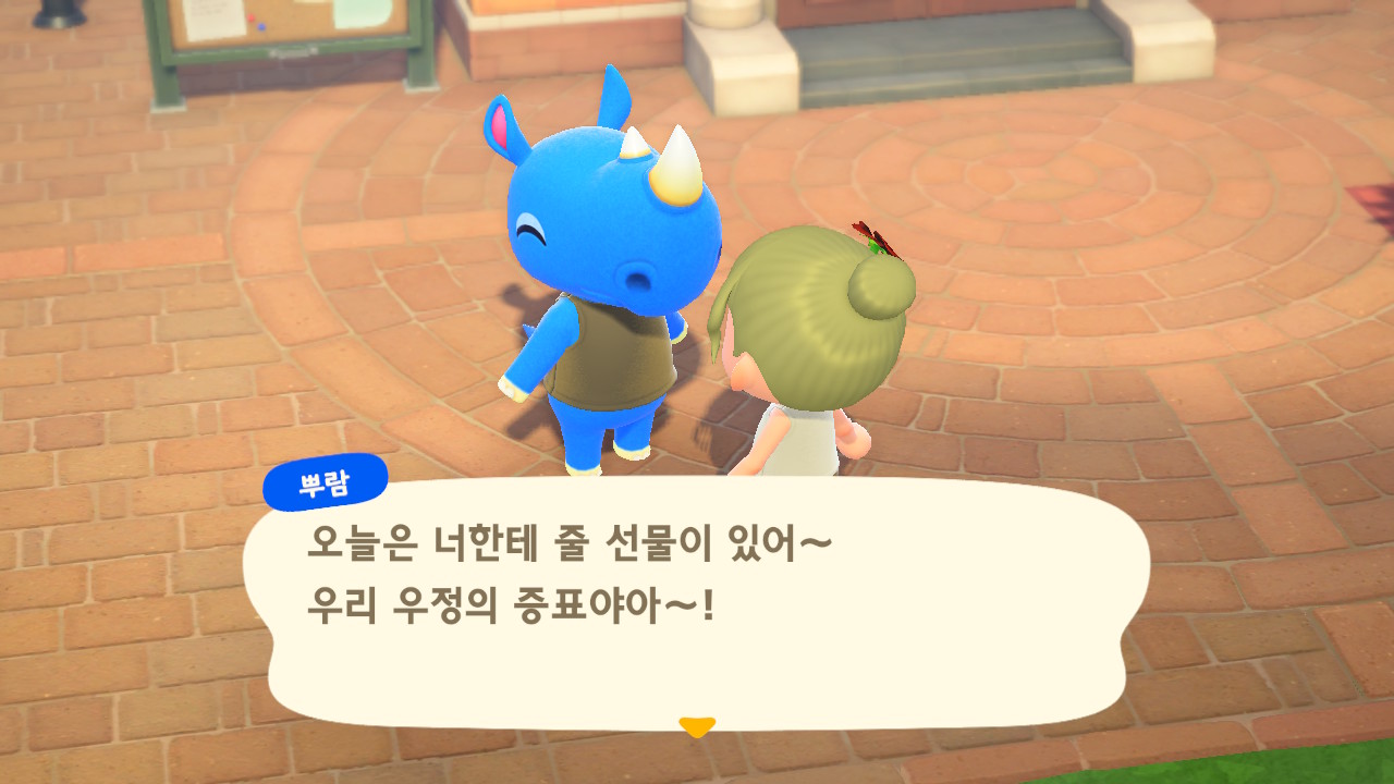 난닝구에 청바지 조합으로 돌아다니던 중에 코뿔소 주민 뿌람이가 나한테 선물을 준다고 띠링~! 하고 다가왔다.