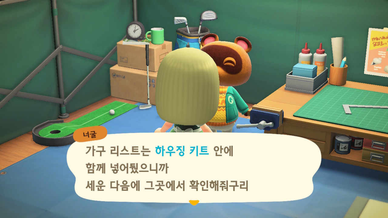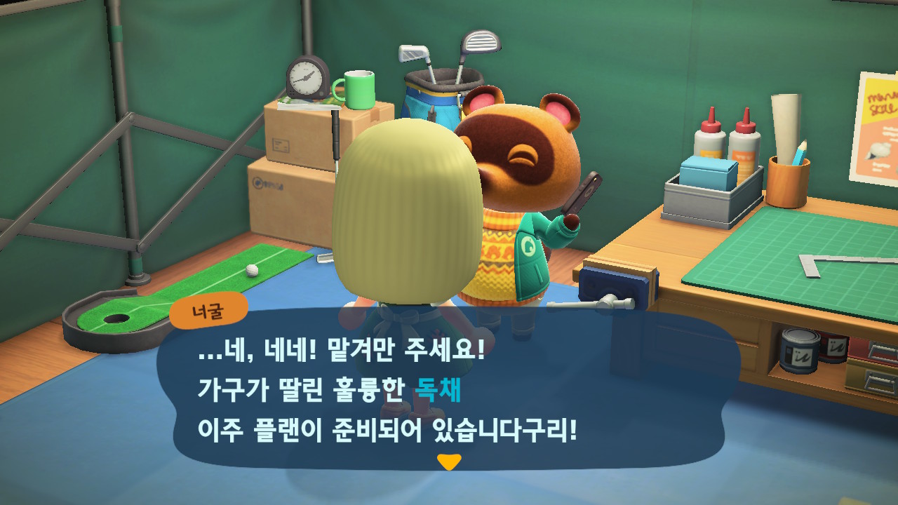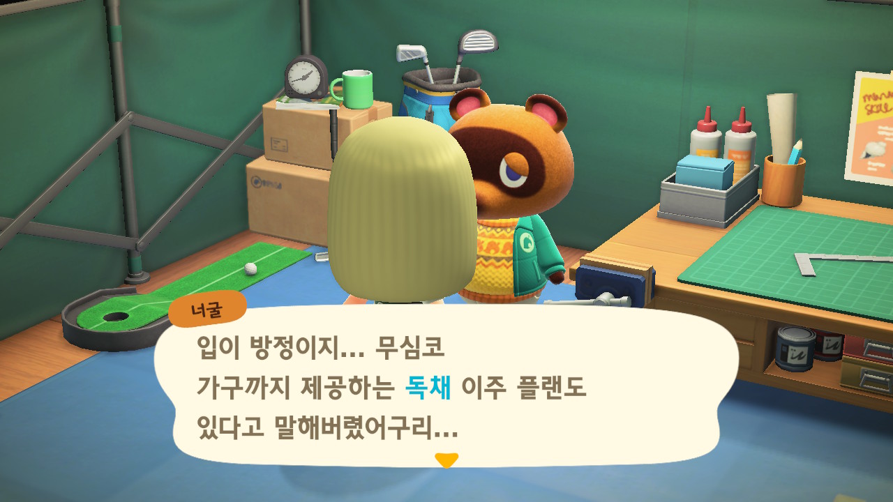 내부와 외부에 가구 18개까지 다 넣고 안내소에 가고 나면 자동으로 너굴이와 대화가 되면서 ㅠㅠ