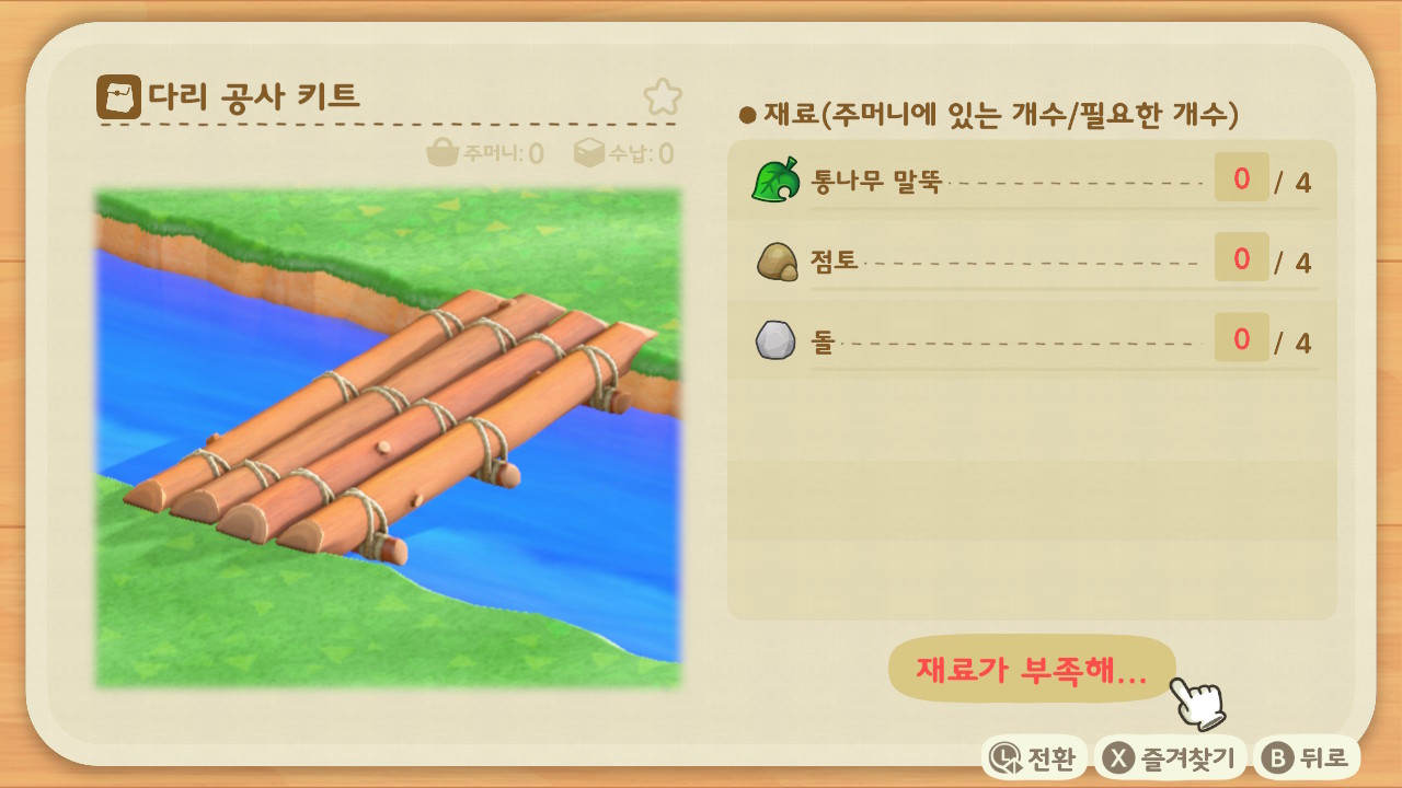 나는 남편 섬에서 더부살이를 하면서 모아둔 재료들이 많으므로 ㅋㅋㅋ 바로 다리 공사 키트를 만들 수 있었다.
