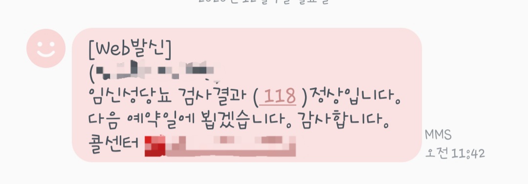 '임신성 당뇨 검사결과 118로 정상입니다' 하고 문자가 왔다.