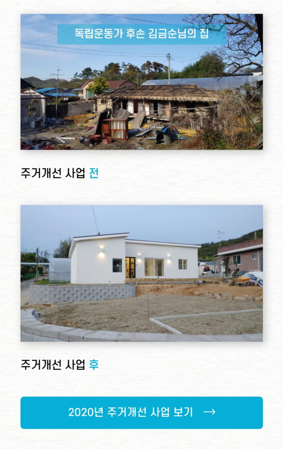 이제라도 많은 애국지사들, 독립운동가들의 후손들이 작으나마 편히 쉴 수 있는 집 한채 제대로 마련해드리고 싶다는 취지로 열악한 환경에서 여전히 가난하게 살고 계신 독립운동가 후손들의 주거 개선 사업을