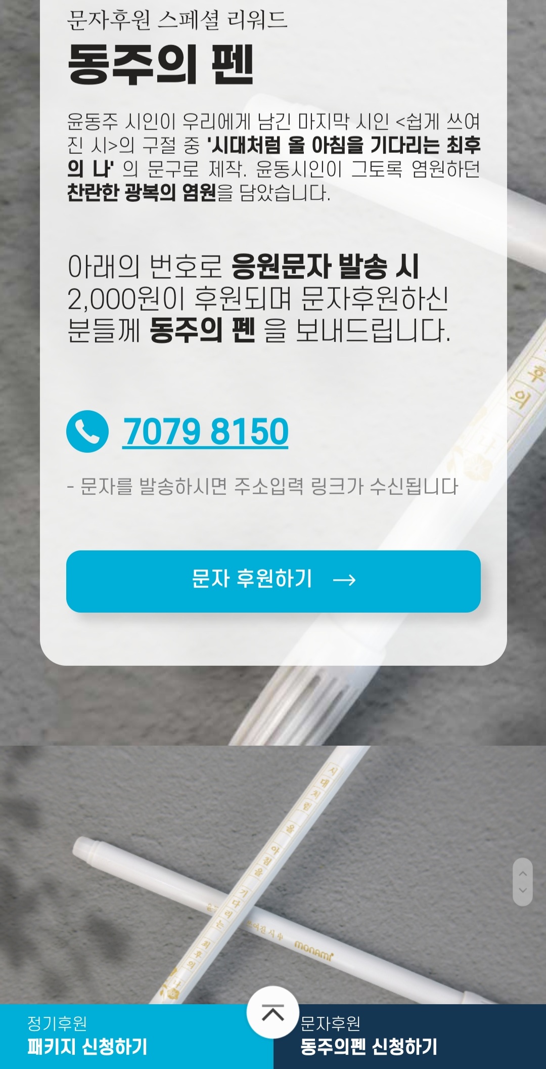 특히, 문자로 참여할 수 있는 2000원의 문자후원은 윤동주의 시 구절이 들어가 있는 '동주의 펜'을 받을 수 있다.