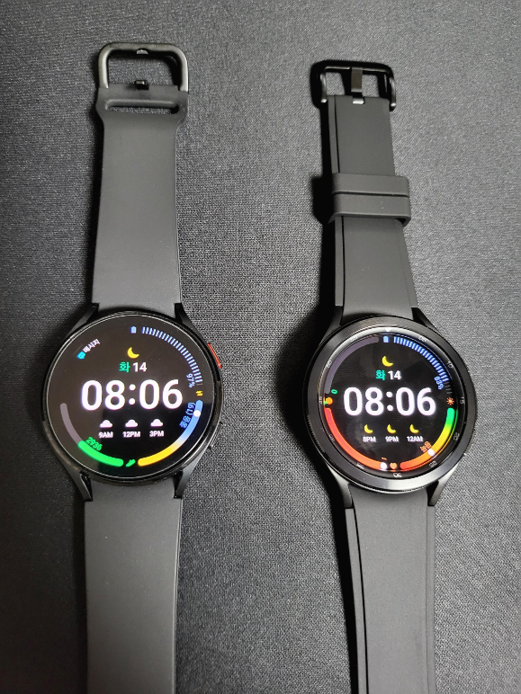 화면크기는 동일하나 물리배젤때문에 워치4클래식이 좀더 묵직한 느낌이 든다. 하지만 취향차이랄까 나는 워치4의 시계 전체에 꽉차보이는 디스플레이가 더 맘에 들었다. 실제 사용시에는 물리배젤이 있는 워치4클래식이 훨씬 사용하기는 편하다. 동일 가격이라면 모르겠으나 굳이 10만원가량 더 지불함에도 클래식을 사야할지는 사실 잘 모르겠다.