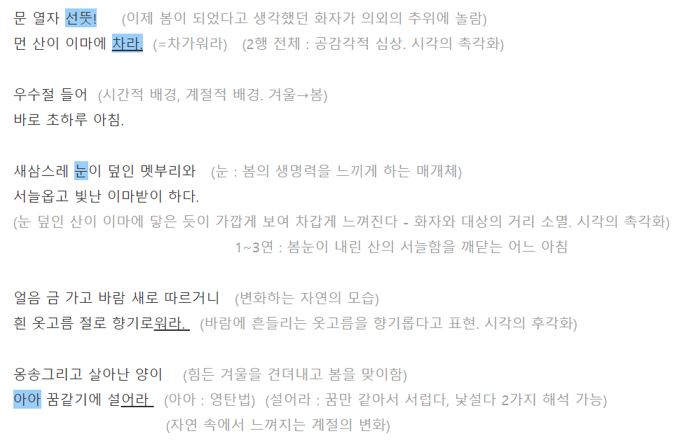 문 열자 선뜻! (이제 봄이 되었다고 생각했던 화자가 의외의 추위에 놀람)