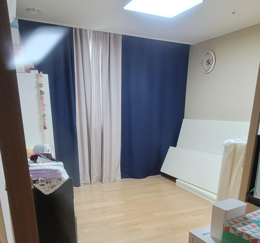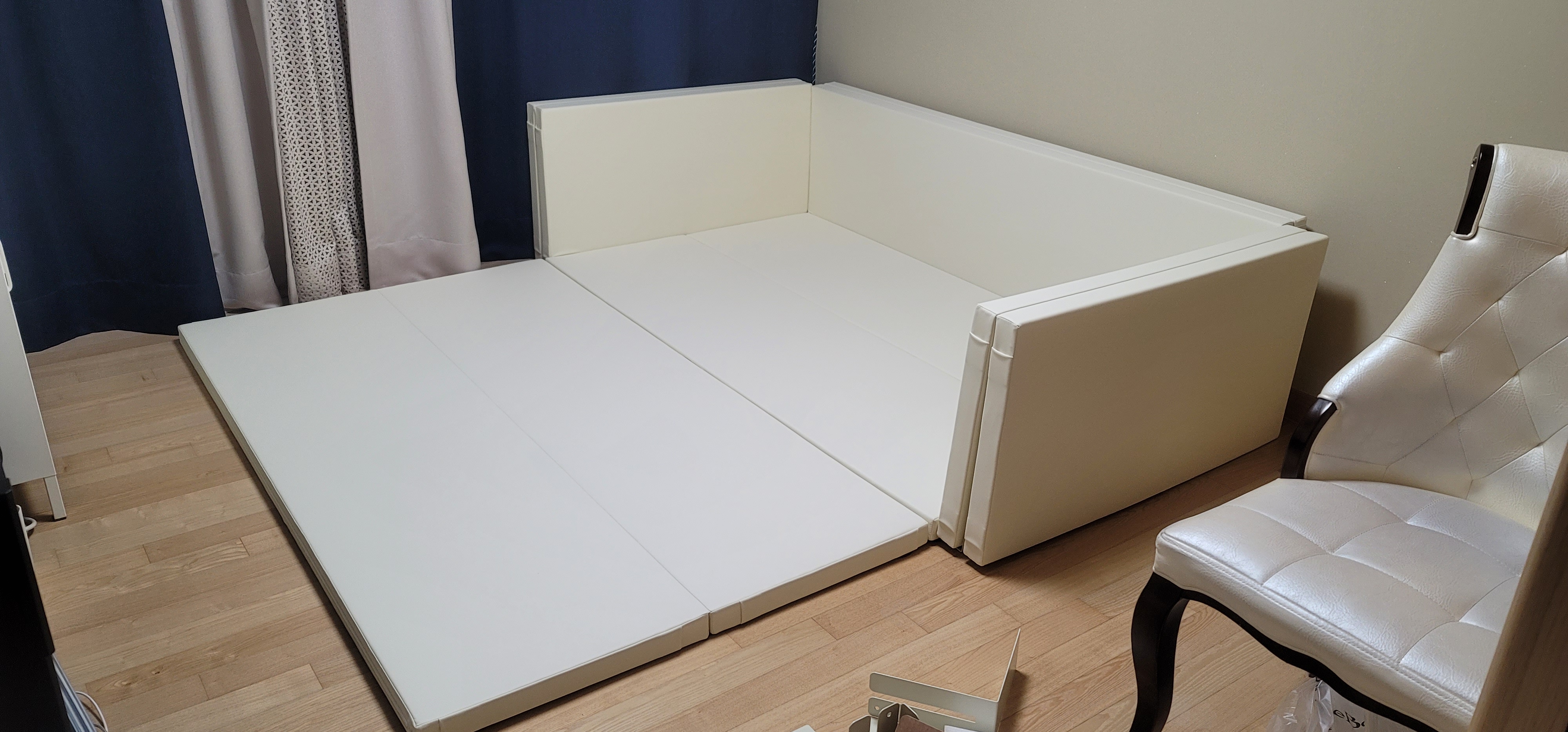 보니타베베 범퍼침대가 도착해서 방 구조를 바꾸고, 청소하고서 매트들을 한쪽에 세움.