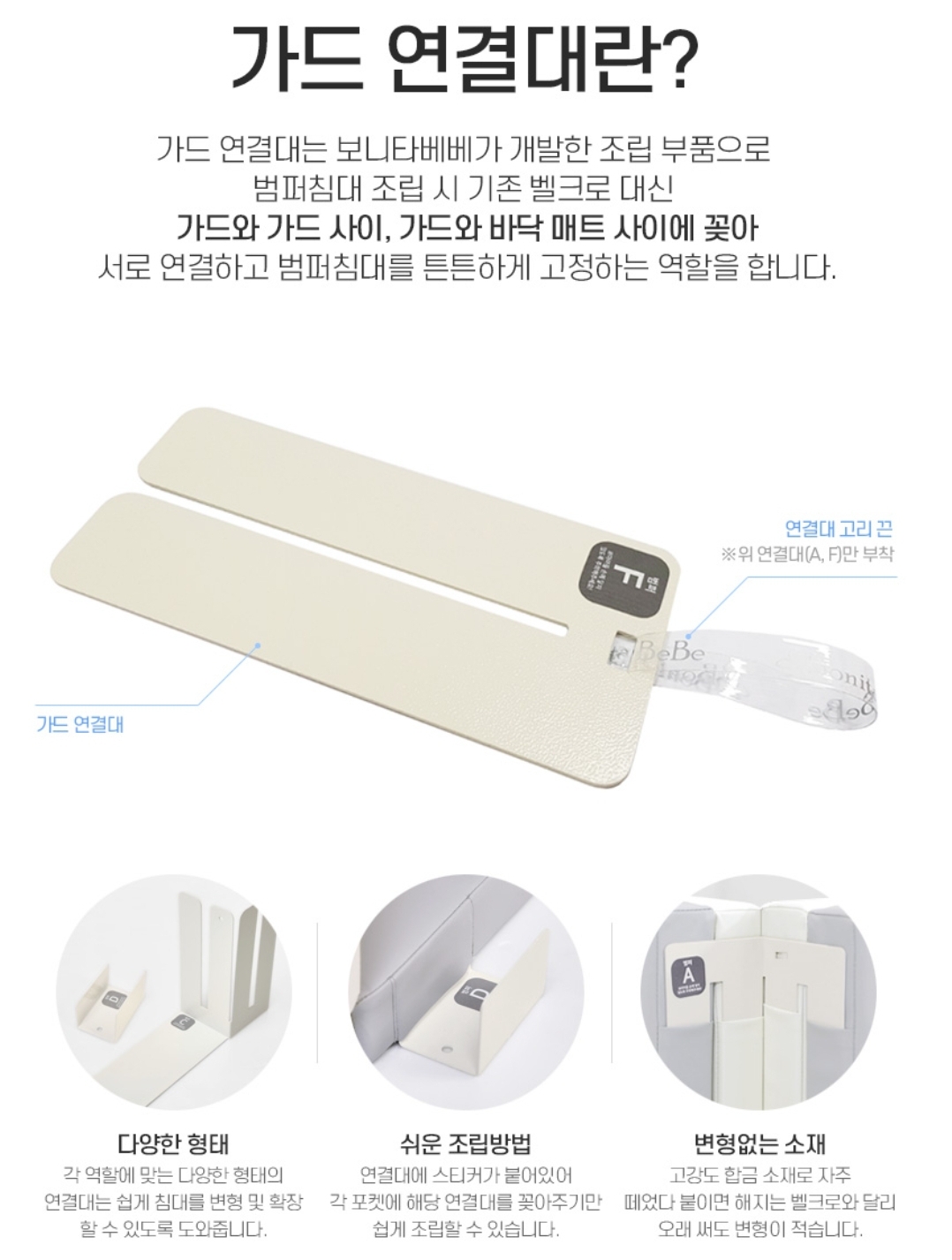 가드연결대는 튼튼한 철제인데 범퍼가드끼리 꼭 맞게 조립될 수 있도록 도와주는 역할을 한다.