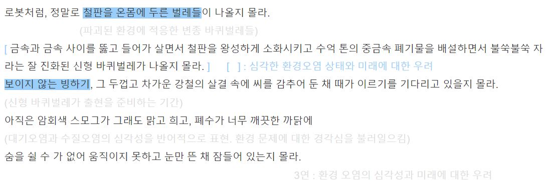 [ 금속과 금속 사이를 뚫고 들어가 살면서 철판을 왕성하게 소화시키고 수억 톤의 중금속 폐기물을 배설하면서 불쑥불쑥 자라는 잘 진화된 신형 바퀴벌레가 나올지 몰라. ] [ ] : 심각한 환경오염 상태와 미래에 대한 우려