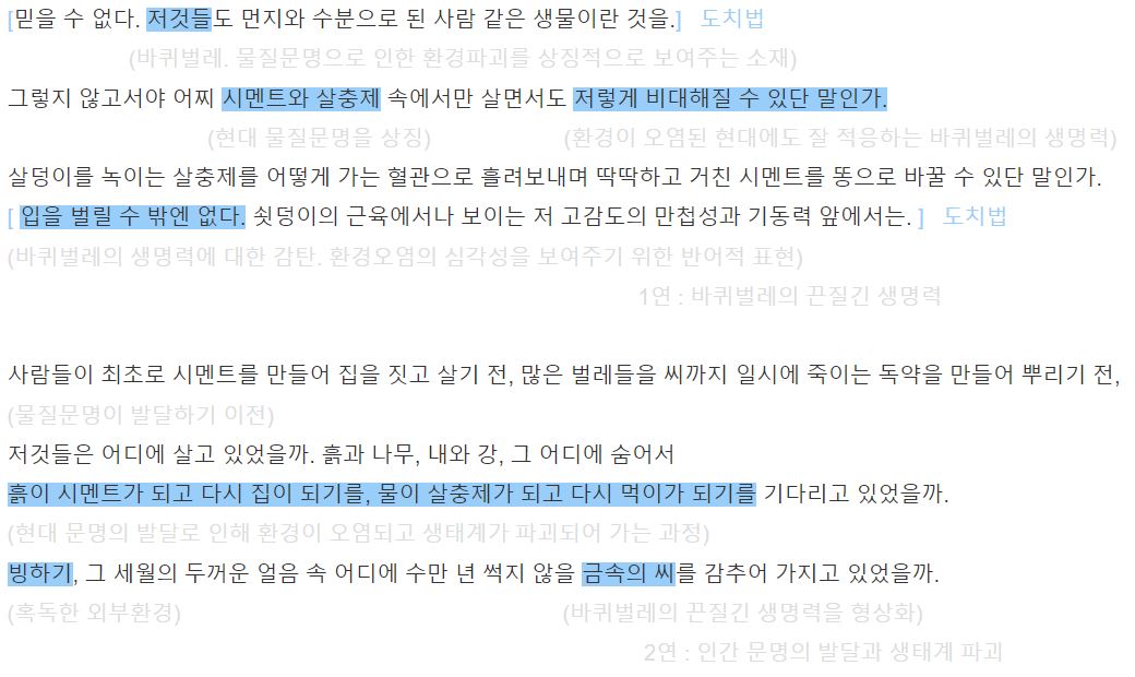 '1연에서 바퀴벌레는 시멘트'와 '살충제'로 대표되는 비생명적 공간에서 자신을 '쇳덩이'와 같이 비생명적인 것으로 바꿔서 살아가고 있다. 이는 자신을 억압하고 있는 비생명적이고 기계적인 현실을 살아가기 위한 어쩔 수 없는 변화인 것이다.