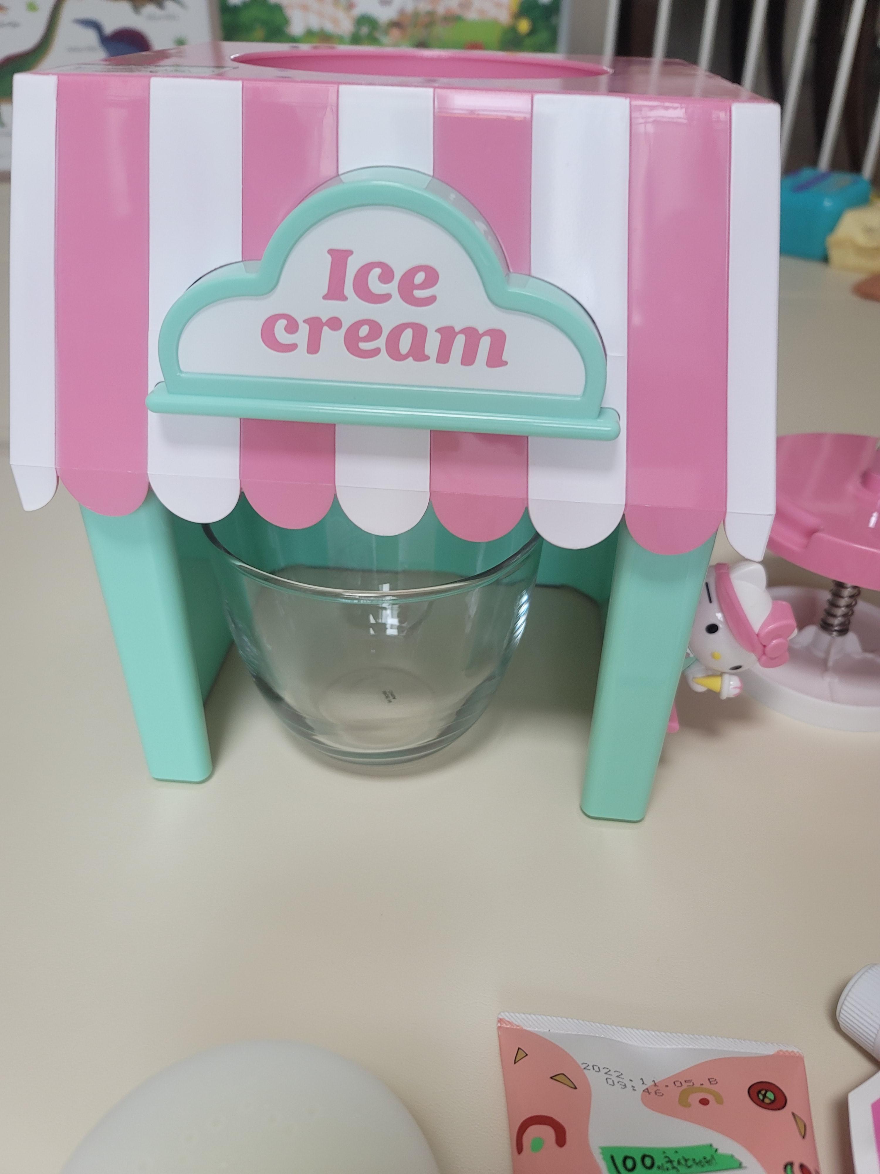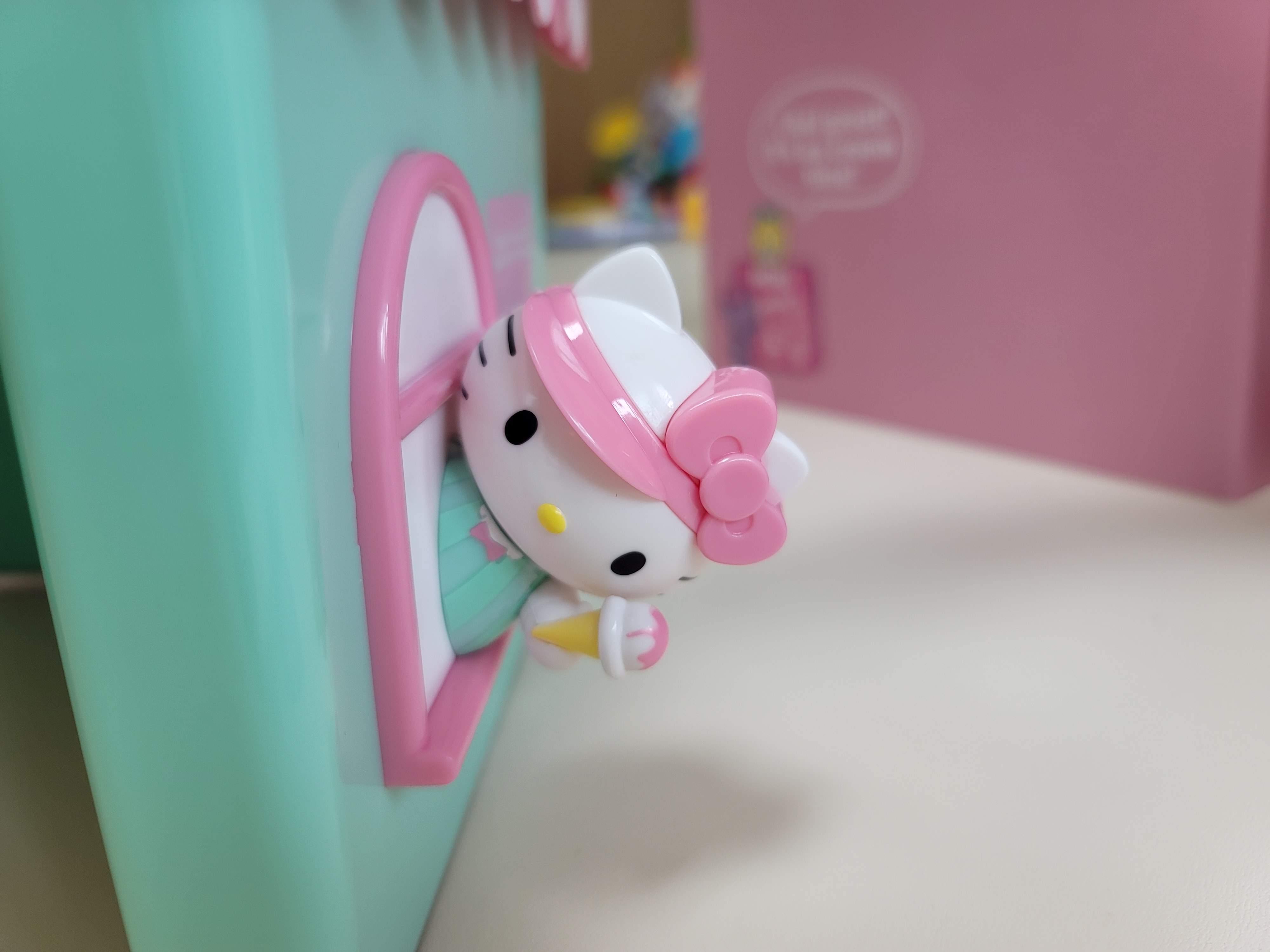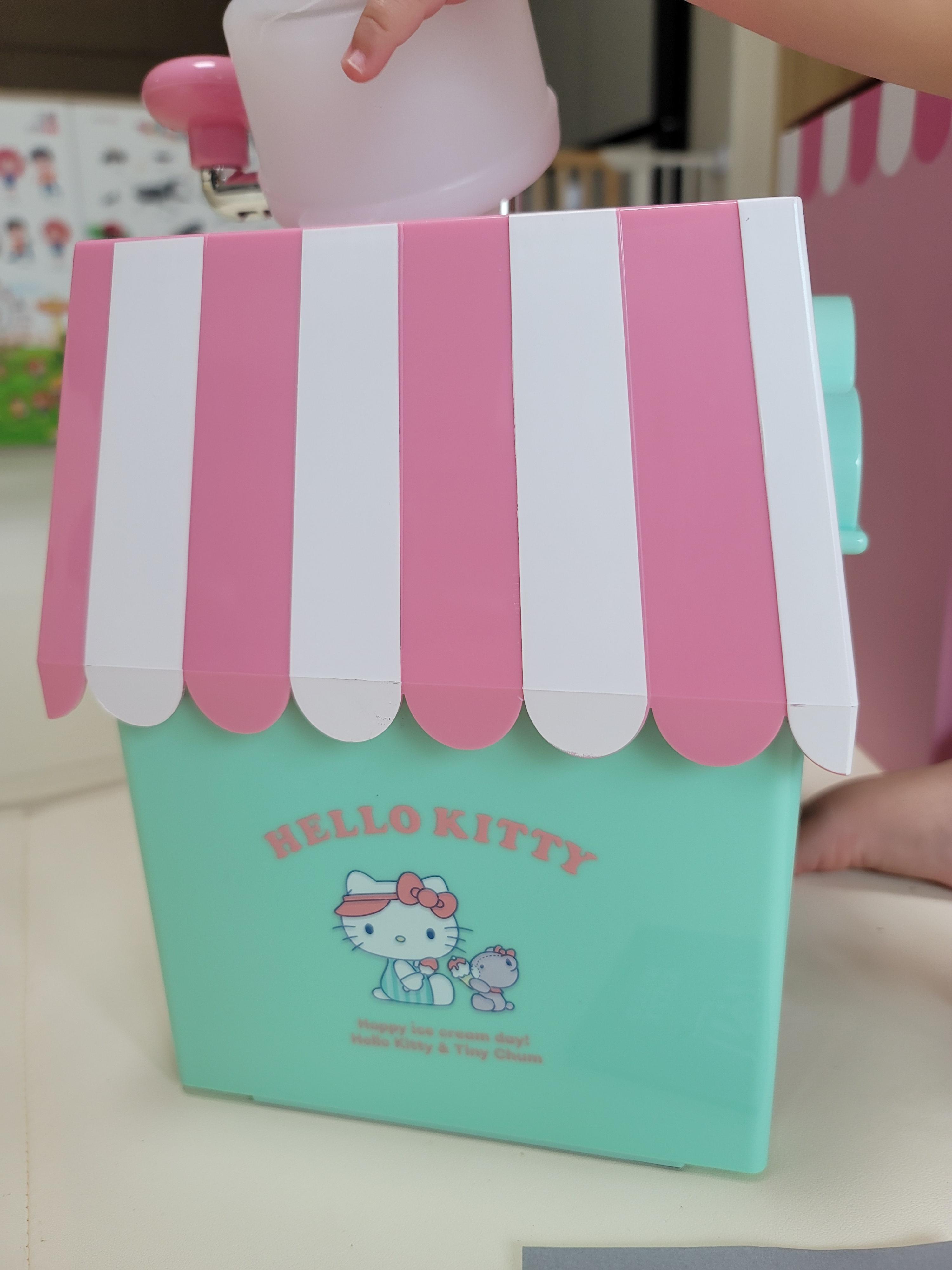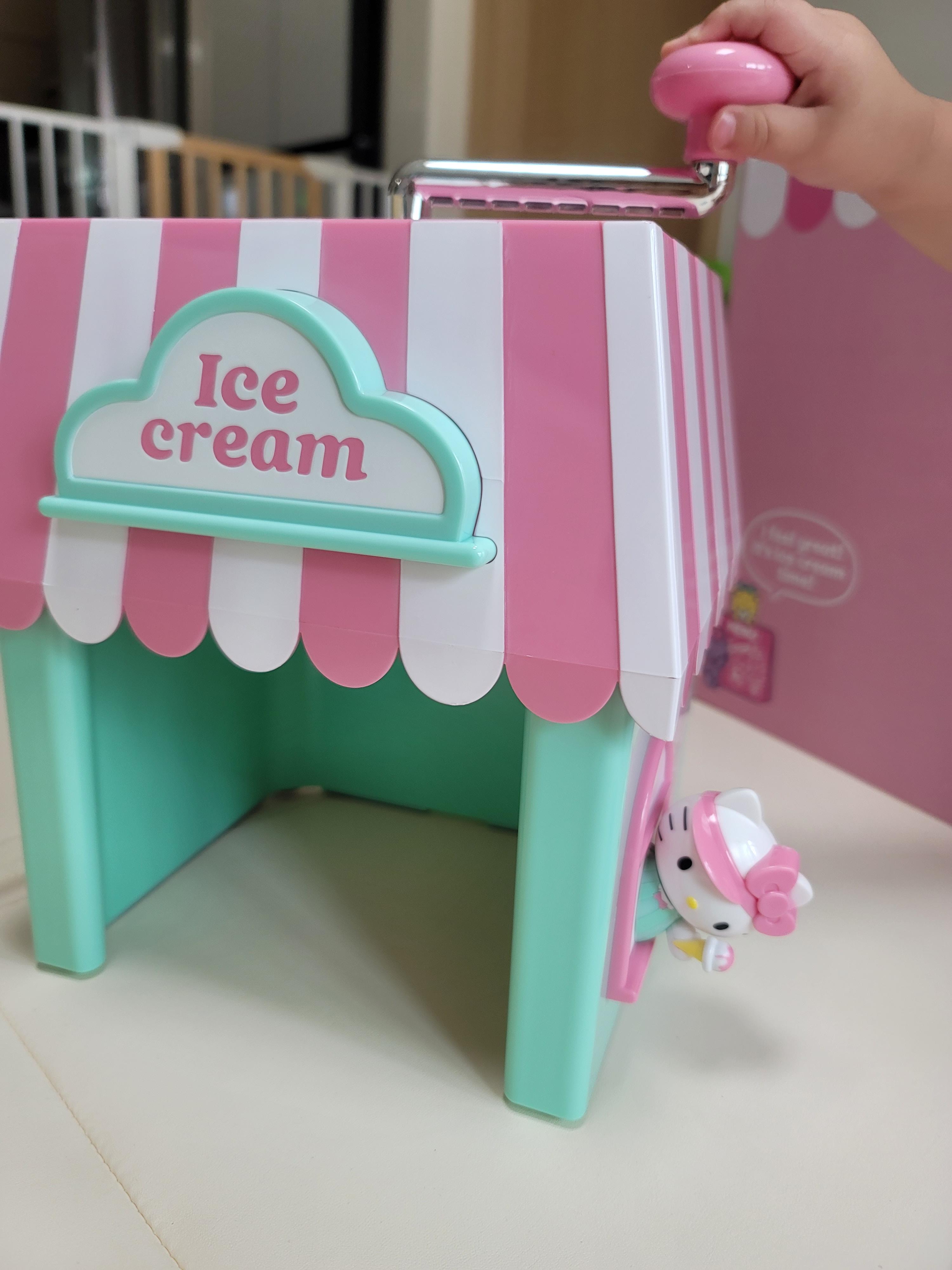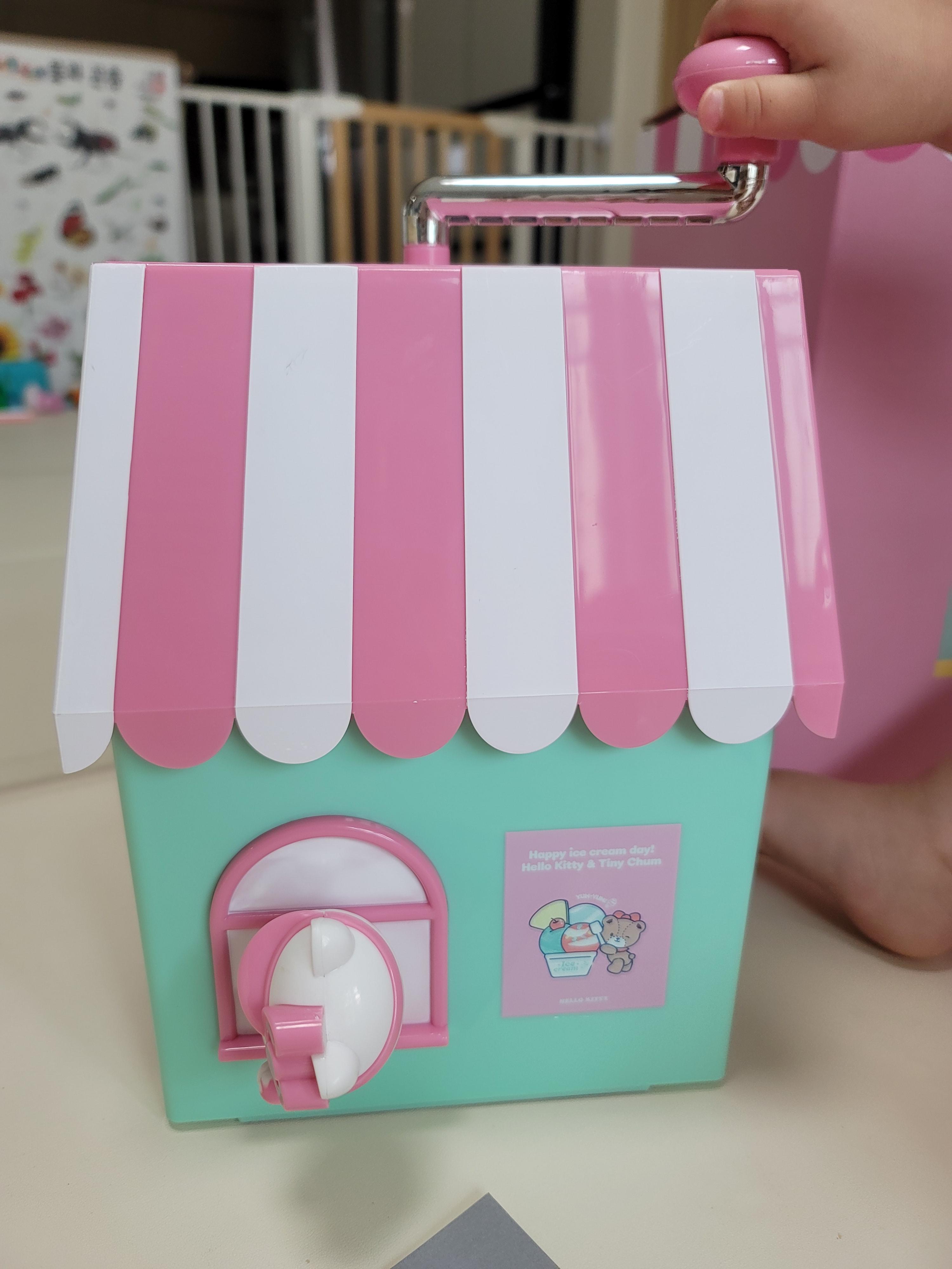 옆면의 창문에서 아이스크림을 건네는 헬로키티.