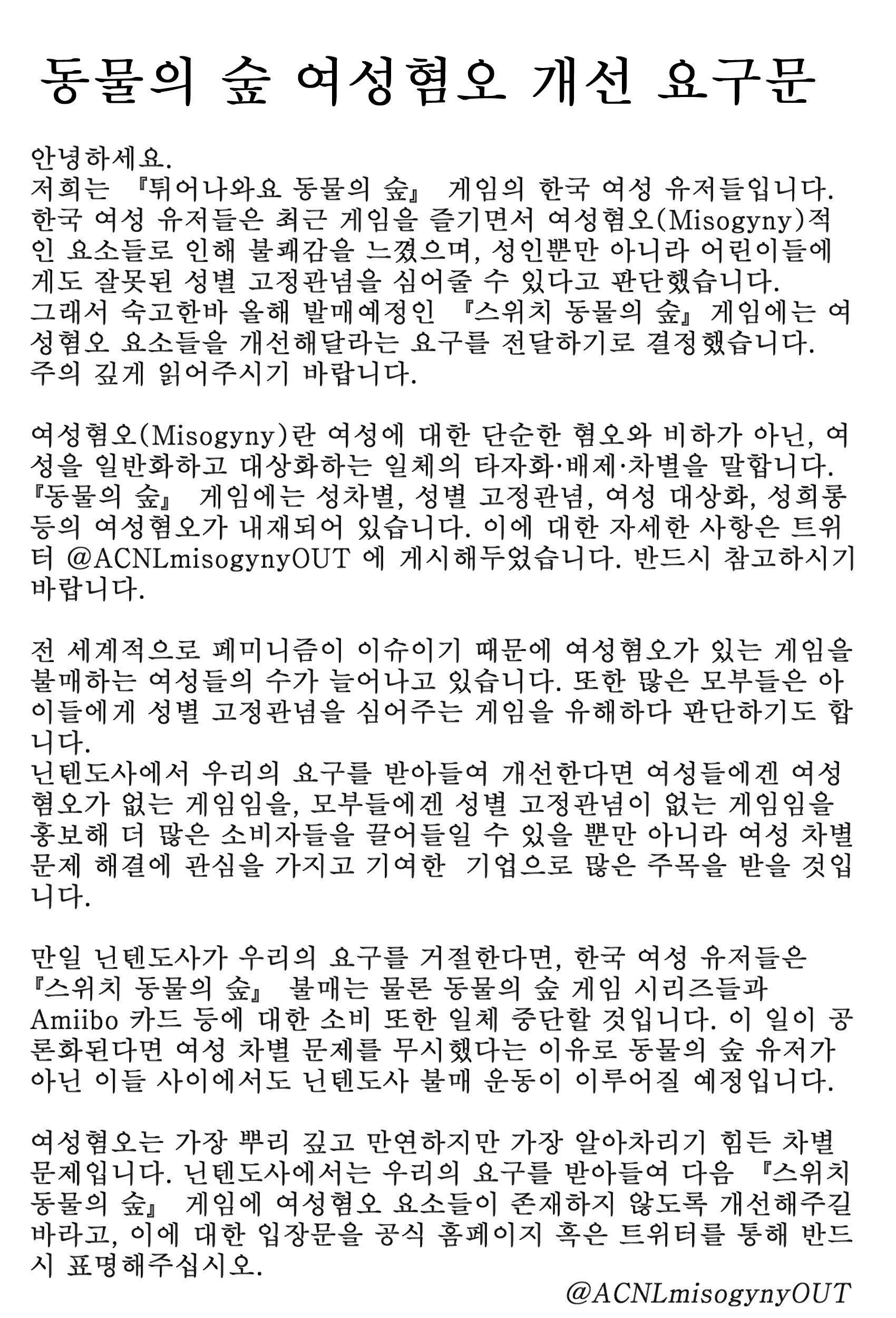 '동물의 숲 여성혐오 개선 요구문'이라는 글이 여러 커뮤니티에 올라오고 있다.