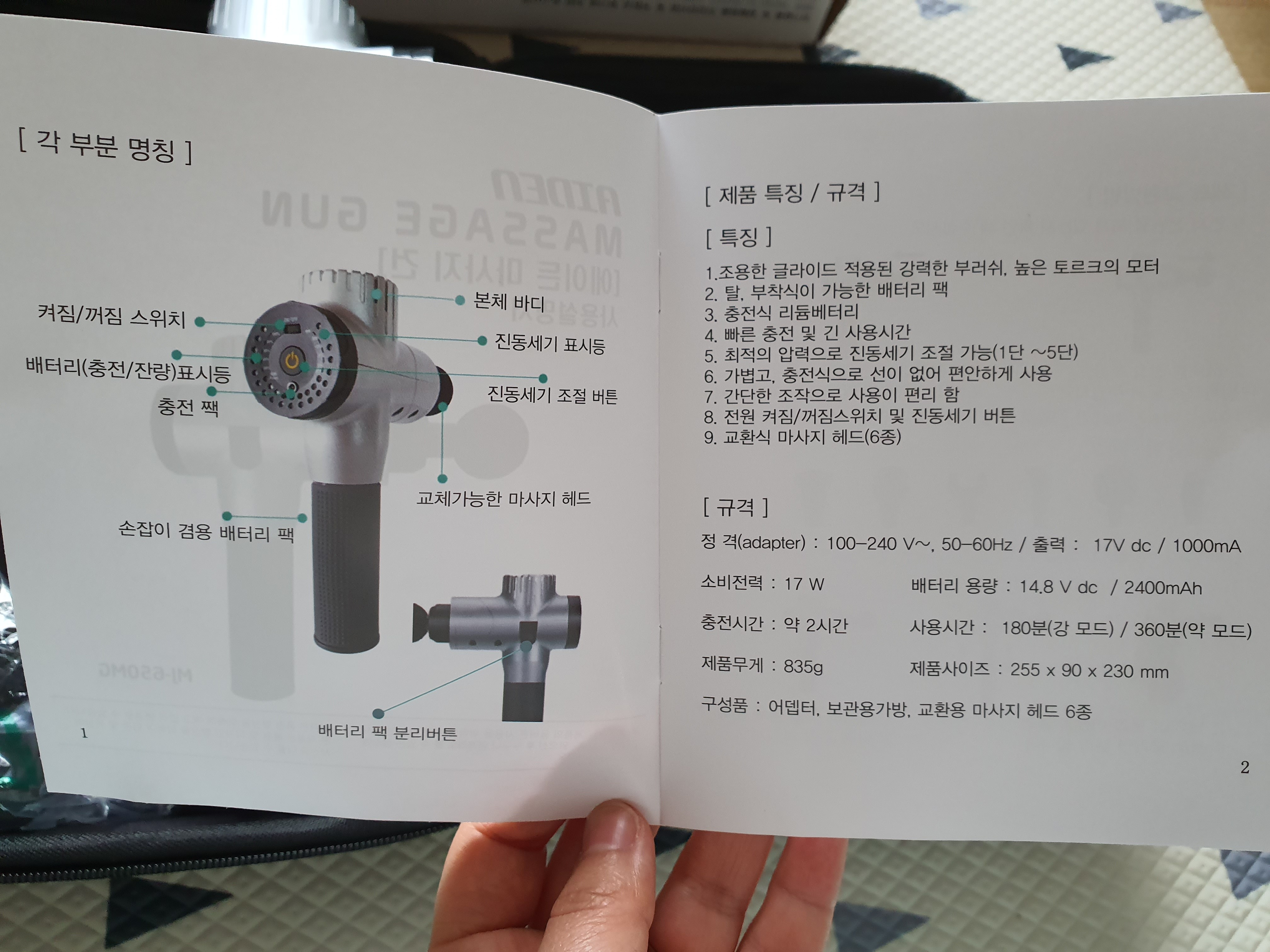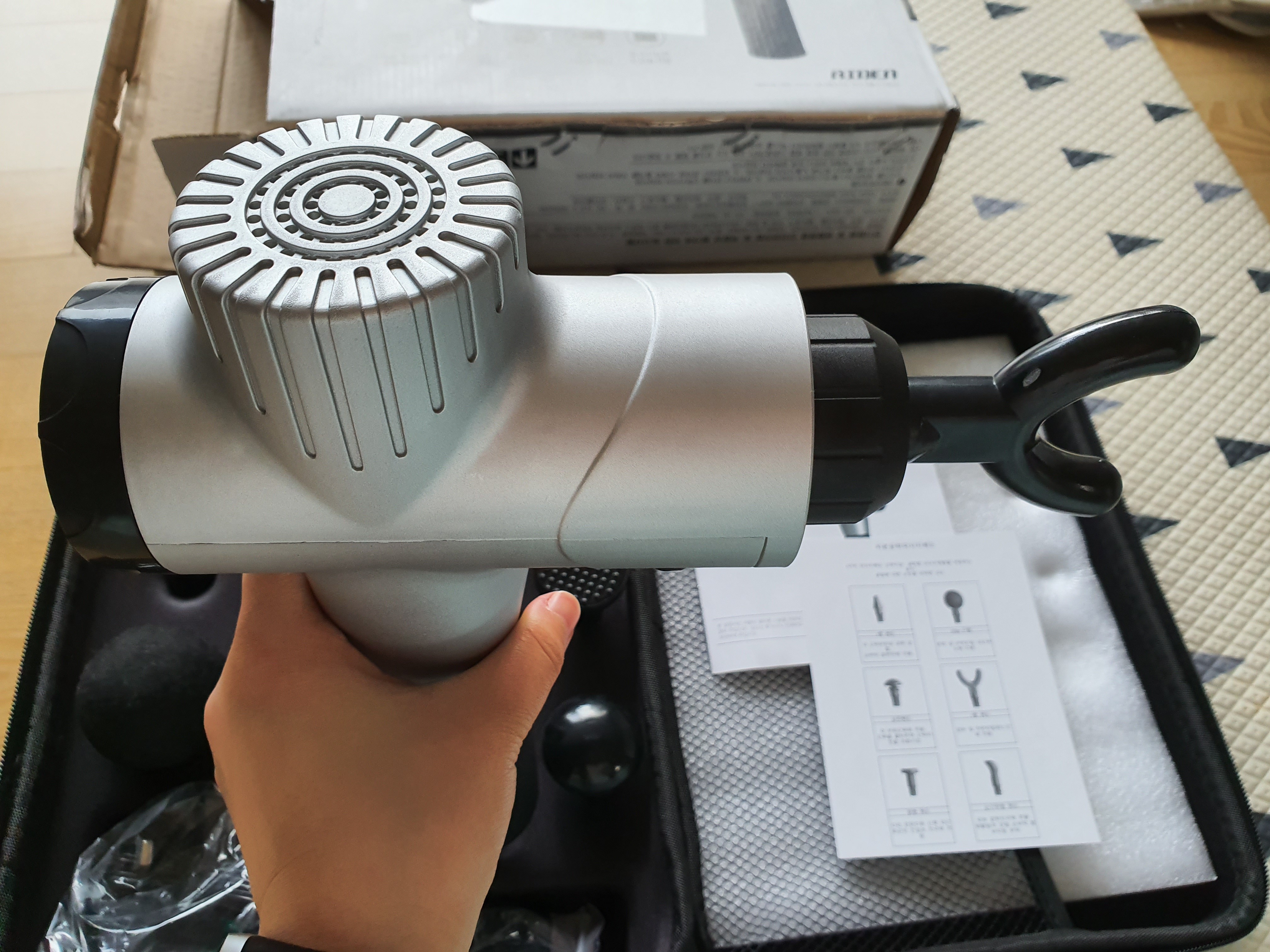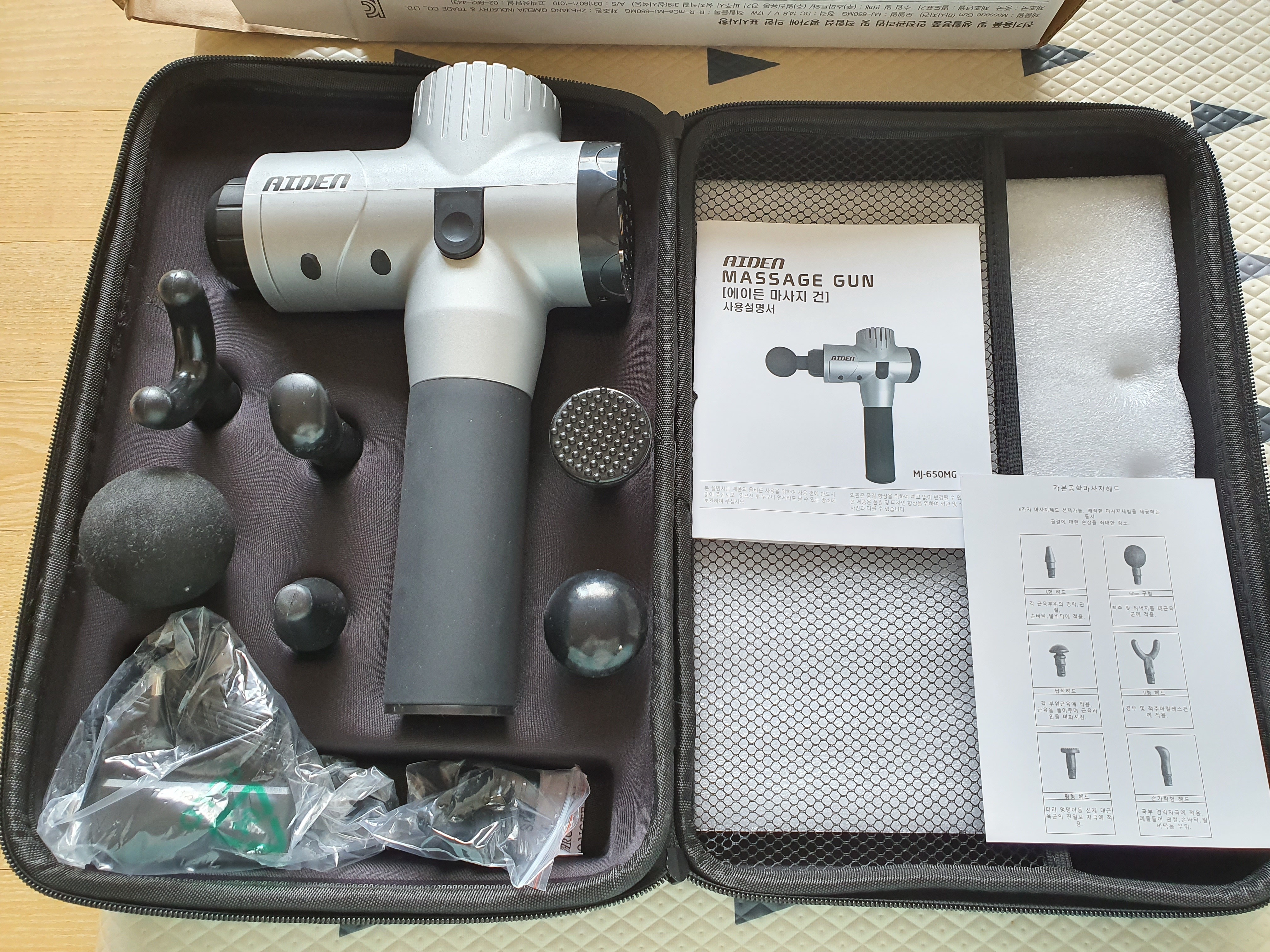 그래서 도착한 에이든 마사지건. 정식 명칭은 '에이든 진동 마사지건 안마기 MJ-650MG' 이다.